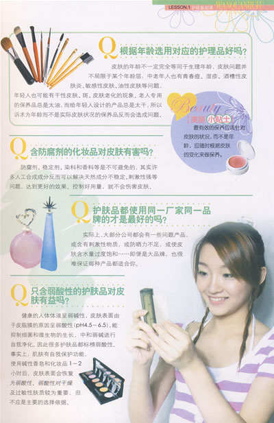 肌肤护理:健康的肌肤是美丽的基础,清洁、保湿、美白、防晒、抗老化以及对付各种皮肤问题等等,都可以在书中得到最实用的指导。当然,还包括对头发的保养。