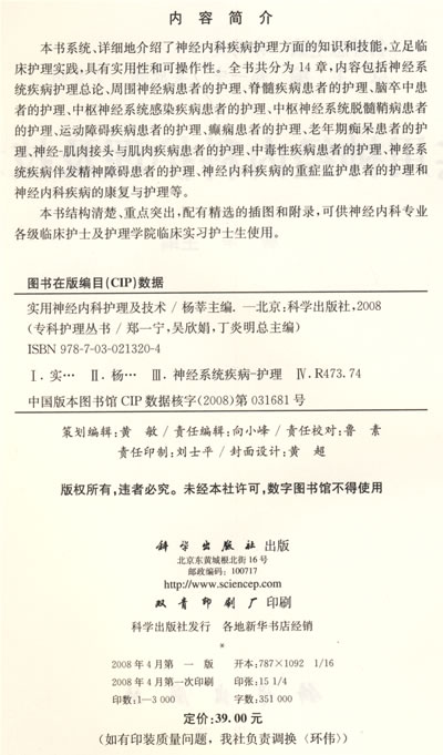 本书结构清楚、重点突出,配有精选的插图和附录,可供神经内科专业各级临床护士及护理学院临床实习护士生使用。