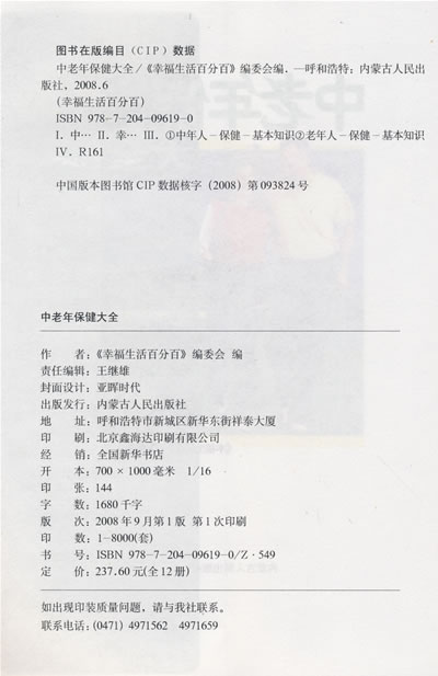 该书运用中医养生学理论和现代医学研究成果,系统介绍了中老年人养生保健的基本知识和具体方法。详解了自然寿命、老年人划分标准与健康、亚健康的概念,中医传统养生及更年期保健与性保健,中老年人心理特点、心理障碍及其防治,饮食、运动、娱乐、睡眠、生活方式、环境气候等对健康的影响与自我保健,以及常见肿瘤防治和定期健康体检等。