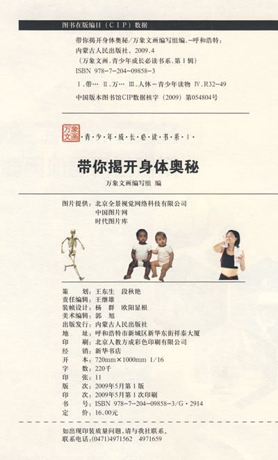 《带你揭秘身体奥秘》为青少年成长必读书系中的一本,带你揭开了人类身体的奥秘。《青少年成长必读书系》信息量大,在包罗万象的知识体系中,总揽了国学精粹、社科立志、政治军事、科学技术、人文历史、山川风物、百业众艺等方面内容,为中华上下五千年文化的“名牌效应”重铸生命,注入现代人的世界视野、理性判断和科学情怀,拓展出更高、更远的新境界。丛书版式新颖,设计精美,图文并茂。大量或直观或蕴籍的图片让人耳目一新,使它成为不同层次、不同地区、不同文化背景的人之间进行有效交流与沟通的“通用语言”和桥梁,在一定程度上消除了因知识层次的差异而带来的传播壁垒,突破了知识精英的狭小范围,赋予大众传播以“大众化”、“普及化”的意义。