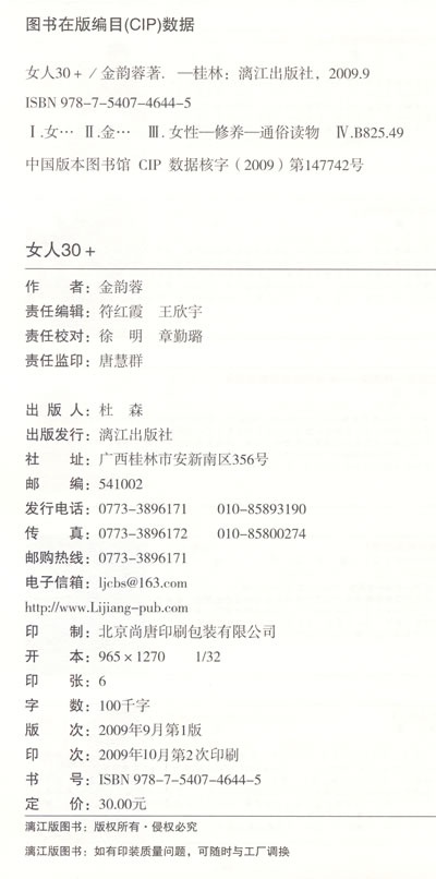 我的30+岁月的确是人生中最大变化,最多彷徨的十年。多希望当年能有像金韵蓉这样睿智而体贴的朋友相伴。现在有了这本书,读者比我更幸运。 ——全国政协委员、阳光媒体集团主席、资深媒体人 杨澜 如果说,你的一生最想要什么?年轻?美貌?财富?地位?健康?你可能会说通通都想要,其实,女人一生最重要的是要培养获得幸福和快乐的能力。从三十岁开始吧,这是你获取这种能力最好的时刻。当然,这种能力如何培养?它的密码在哪里?我推荐你用心去读金老师的《女人30+》,她会给你最贴心和最有益的帮助和解答。 ——全国政协委员、中国美容时尚报社长兼总编辑 张晓梅 我相信人生的快乐和意义在于平衡:爱情、亲情、友情、事业、健康,五门功课都应该有个及格分,或许某一科或几科还能得优秀,这样的人生才快乐和充实。但现实生活中这样的平衡却寥若晨星。我们在拥有越来越多选择和色彩的同时也越来越容易迷失,尤其是在30+这样肩负种种期待、面对种种诱惑却已经不再一味意气风发、笑傲江湖的年龄。金老师以她洞彻人生的睿智,悲天悯人的仁爱,将她精粹的人生感悟娓娓道来,帮我们在一个越来越物质化的社会中找到快乐的人生平衡。 ——宝洁(中国)公司大中华区对外事务部高级总监 陈力
