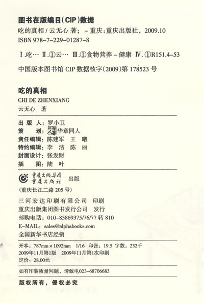 我一向认为人们对于“吃什么、怎么吃”要有自己的营养主张,不能盲从或迷信于没有科学依据的说法。云无心从食品科学的角度为大众剖析了“吃的真相”,读完此书,你将学会用更科学和客观的态度去看待饮食问题,不至于无所适从或无端恐慌。 ——于康 著名营养