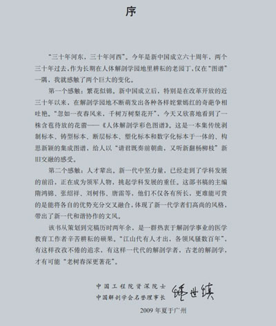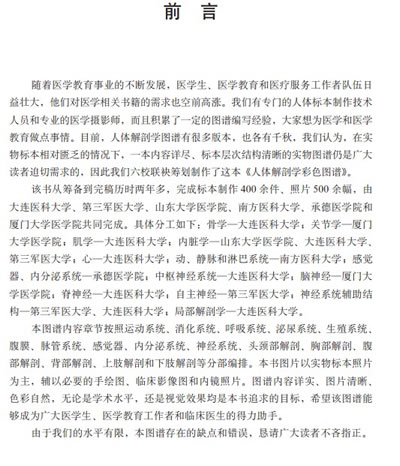 随着医学教育事业的不断发展,医学生、医学教育和医疗服务工作者队伍日益壮大,他们对医学相关书籍的需求也空前高涨。我们有专门的人体标本制作技术人员和专业的医学摄影师,而且积累了一定的图谱编写经验,大家想为医学和医学教育做点事情。目前,人体解剖学图谱有很多版本,也各有千秋,我们认为,在实物标本相对匮乏的情况下,一本内容详尽、标本层次结构清晰的实物图谱仍是广大读者迫切需求的,因此我们六校联袂筹划制作了这本《人体解剖学彩色图谱》。