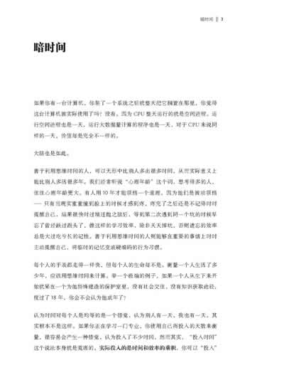 认为时间对每个人是均等的是一个错觉,认为别人有一天,我也有一天,其实根本不是这样。如果你正在学习一门专业,你使用自己所投入的天数来衡量,很容易会产生一种错觉,认为投入了不少时间,然而其实,“投入时间”这个说法本身就是荒唐的,实际投入的是时间和效率的乘积。你可以“投入”很多时间在一件事情上面,却发现毫无进展,因为你没有整天把你要做的事情,要学习的东西常驻在你的大脑中,时刻给予它最高的优先级。你走路的时候吃饭的时候做梦的时候,心心念念想的就是这件事情,你的CPU总是分配给它,这个时候你的思维时间就被利用到了极致,你投入的时间就真正等于了实际流逝的时间,因为你的CPU是满载的。