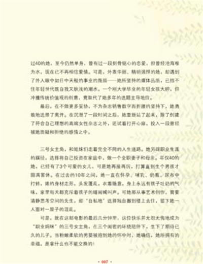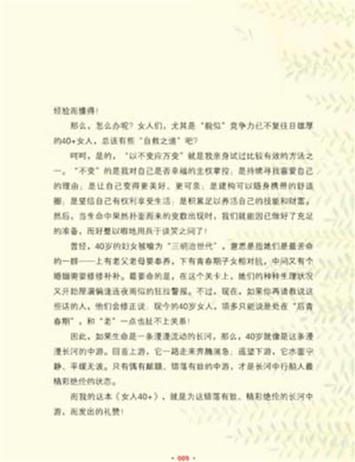 如果40+的女人真需要看些自己吓唬自己的书的话,书店里已经洋洋洒洒地排列了很多,并不需要再增加我这一本来落井下石。而且,以我个人迈入40+以后的亲身体验来看,我深刻理解一个年过40的女人,需要的,不是另一本吓唬她的书,而是一本既有着像长辈柔软胸膛般的暖暖温度、又有着面对专家般能支好招的书。这本书能轻轻地拍着她的背、和蔼地搂着她的肩,告诉她:“事情没有你想象的那么严重,也没有你想象的那样无可挽回,况且,我们还有好办法来对付它呢!”。