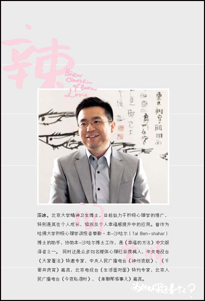 北京大学精神卫生博士,目前致力于积极心理学的推广,特别是其在个人成长、组织及个人幸福感提升中的应用。曾作为哈佛大学积极心理学讲授者泰勒?本-沙哈尔(TalBen-shahar)博士的助手,协助本-沙哈尔博士工作,是《幸福的方法》中文版译者之一。同时还是众多知名媒体心理栏目撰稿人,中央电视台《大家看法》特邀专家,中央人民广播电台《神州夜航》、《千里共良宵》嘉宾,北京电视台《生活面对面》特约专家,北京人民广播电台《今夜私语时》、《单聊那些事儿》嘉宾。