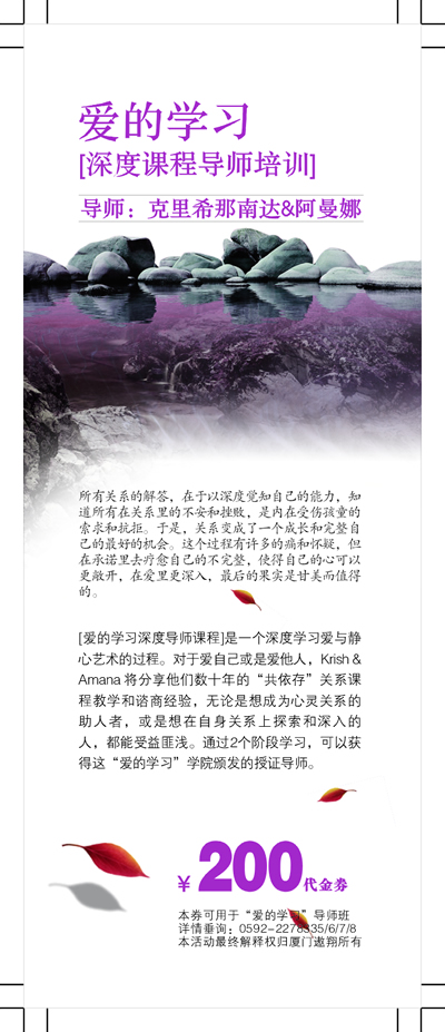 如果读者看了本书之后,觉得深得我心,的确是治疗你病症的最好药方,但是觉得还是有抓不到药的感觉,那么我建议你多做一些静心的活动,扩展你的灵性空间,同时,最好的方法还是参加作者和他夫人每年来中国举办的工作坊。