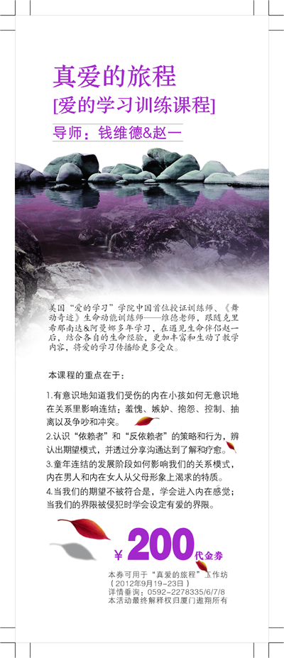 2010年初,我在情绪非常低落的状况下,参加了作者夫妇在上海举行的“真爱的旅程”工作坊。首先让我印象深刻的就是这对夫妻的能量和气质,真是令人一见倾心。而他们两人的配合度,也真是默契到了极点,让整个工作坊在他们温言柔语的带领下,进行得非常有质感。
