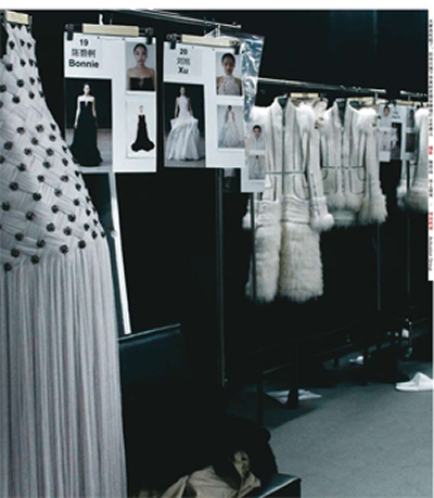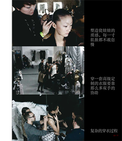 这些紧张的战士们严阵以待,在出台口按次序排着长队,现场协调戴着耳麦等候第一道指令;设计师再一次告诉模特你们是战士,要骄傲地行走在T台战场上,并用力地用手指打出代表胜利的V字。