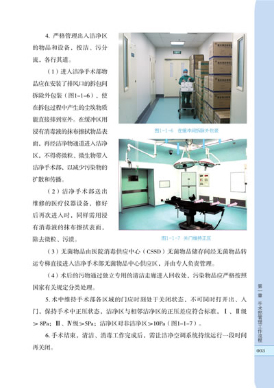 5.术中维持手术部各区域的门应时刻处于关闭状态,不可同时打开出、入门,保持手术中正压状态,洁净区与相邻洁净区的正压差应符合标准, I、Ⅱ级>8Pa;Ⅲ、IV级>5Pa;洁净区对非洁净区>10Pa(图1—1—7)。