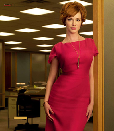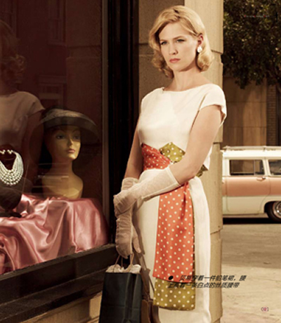 举例来说,琼向来十分注重她那迷人的身材,从不放弃任何机会来表现自己。她知道这是自己的资本,也明白如何充分显示这种特点。相反的,贝蒂知道自己的长处在于自己那端庄的主妇形象,而这种形象通过一串灿灿发亮的珍珠项链和合身的长裙能够最大限度地展现出来,她引领了一种潮流。当然,我们也不能忽略了派奇?奥尔森,她是那种传统校园女孩的形象,穿的都是花格子、圆点或是条纹图案的衣服,从她的外形我们可以看出她那积极向上的精神和野心。
