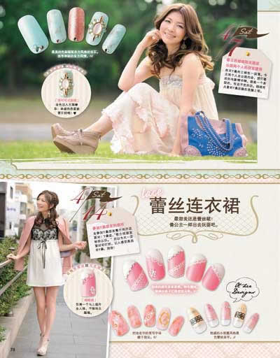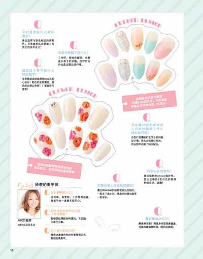 海外时尚都市流行美甲彻底大调查!巴黎、洛杉矶、夏威夷、伦敦人气美甲大放送!想要知晓一切关于美甲的消息,跨越国界向世界传达对美甲的热爱;又到了露出美脚的季节了,从基础的护理上色到扎染花纹、钻石美甲、贴纸美甲,还有适合各种肤色美眉的经典款式,只有想不到,没有做不到;宝石美甲,沉溺于美甲映出的高雅光辉;HelloKitty、米老鼠、白兔凯西、小鹿、小白兔,带你走进彩绘卡通世界;走进身边的美甲大师,梁劲强、吴丹、王薪雨为带来中国风特点的美甲作品;全面介绍中国美甲行业现状,深刻分析行业桎梏,为美甲人提供权威高效的服务信息,敬请关注本期新栏目——《先锋快讯》、《跟我学管理》。让我们一起来关注本期的《读者欣赏?美甲先锋》吧!