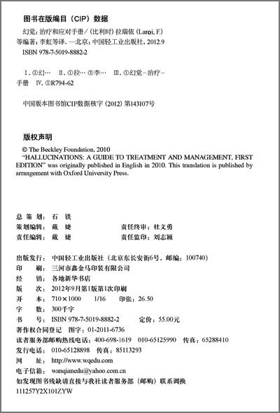 1.本书是国内第一本专门针对幻觉治疗的书,其中既包括药物治疗,也包括系统的心理治疗。