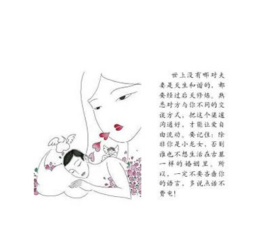 不要觉得世上有哪对夫妻是天生和谐的,他们都要经过后天修炼。而你要做的第一步就是熟悉对方与你不同的交谈方式,把这个渠道沟通好,才能让爱自由流动。你要记住:除非是小龙女,否则谁也不想生活在古墓一样的婚姻里。所以,一定不要吝啬你的语言,多说点话不费电!