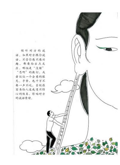 1、倾听对方。如果对方跟你说话,不管你感不感兴趣,都要及时给出点反应,哪怕是“没错”、“恩啊”的语气词,或者仅仅一个会意的眼光、手势,也千万不要不理不睬,否则很容易给人造成漫不经心的感觉,影响对方的说话情绪。