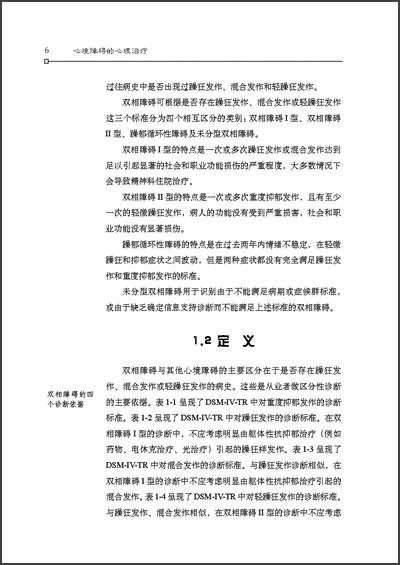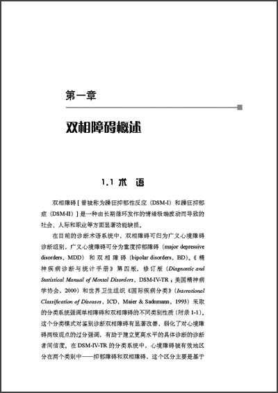 在目前的诊断术语系统中,双相障碍可归为广义心境障碍诊断组别,广义心境障碍可分为重度抑郁障碍(major depressivedisorders,MDD)和双相障碍(bipolardisorders,BD)。《精神疾病诊断与统计手册》第四版,修订版(Diagnostic and StatisticalManual of MentalDisorders,DSM-IV-TR;美国精神病学协会,2000)和世界卫生组织《国际疾病分类》(InterationalClassification of Diseases,ICD,Maier &Sadnmann,1993)采取的分类系统强调单相障碍和双相障碍的不同类别性质(附录1-1)。这个分类模式对鉴别诊断双相障碍有显著改善,弱化了对心境障碍两极观点的过分强调,有助于建立更高水平的具体诊断的诊断者间信度。在DSM-IV-TR的分类系统中,心境障碍被有效地区分在两个类别中——抑郁障碍和双相障碍,这个区分主要是基于过往病史中是否出现过躁狂发作、混合发作和轻躁狂发作。
