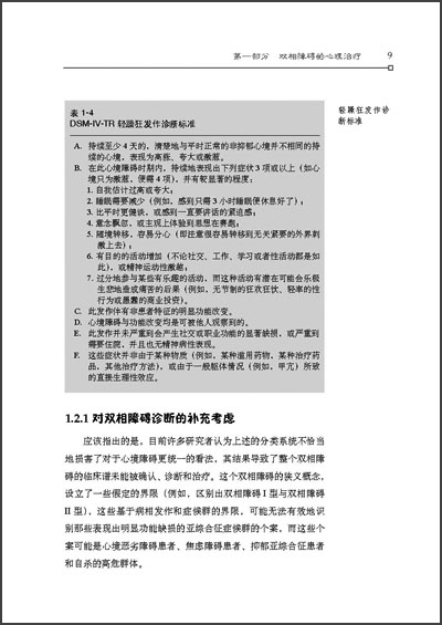 双相障碍与其他心境障碍的主要区分在于是否存在躁狂发作、混合发作或轻躁狂发作的病史。这些是从业者做区分性诊断的主要依据。表1-1呈现了DSM-IV-TR中对重度抑郁发作的诊断标准。表1-2呈现了DSM-IV-TR中对躁狂发作的诊断标准。在双相障碍I型的诊断中,不应考虑明显由躯体性抗抑郁治疗(例如药物、电休克治疗、光治疗)引起的躁狂样发作。表1-3呈现了DSM-IV-TR中对混合发作的诊断标准。与躁狂发作诊断相似,在双相障碍I型的诊断中不应考虑明显由躯体性抗抑郁治疗引起的混合发作。表1-4呈现了DSM-IV-TR中对轻躁狂发作的诊断标准。与躁狂发作、混合发作相似,在双相障碍II型的诊断中不应考虑明显由躯体性抗抑郁治疗引起的轻躁狂发作。