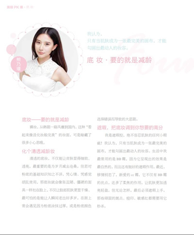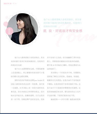 为什么呢?作为主编和前辈的我虽然有诸多职场经验和良好的奋斗习惯,但在美容这一重大问题上,老实讲,除了跟随我们《时尚芭莎》美容总监小武同学,还真的差一大截。但是,我必须真诚地告诉大家,我们杂志的美容内容是我抵抗衰老、每天睡四五小时还照样容光焕发的根本保证。因为,小武是一个极具说服力、有影响力而且很酷的编辑。