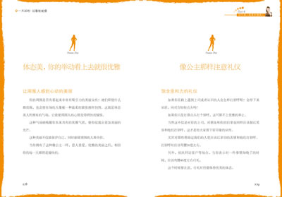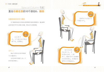 基本体态——站姿基本体态——坐姿Part 1 成为“体态美人”有很多好处变美只需要一星期良好的体态能打造左右对称的你体重减少了3公斤 腰也变细了外表印象分提高了好几倍被别人夸赞 “看起来变年轻了啊”额外的进食减少了 身体没那么容易发胖了不那么容易疲劳了 寒症也减轻了不少粗糙的皮肤逐渐得到改善肩周炎、腰疼的症状减轻了顽固的便秘消失了专栏:彻底消除顽固型便秘的练习能穿更多漂亮衣服了走在路上能感觉到 大家投来赞赏的目光Part 2 瘦下来的秘密就在于体态总是瘦不下来 原来是由于身体“歪斜”造成的消除身体歪斜 只需轻松养成这些习惯专栏:了解自身的歪斜在哪里专栏:消除“歪斜”的运动方法专栏:优雅而正确的站姿专栏:容易犯错的站姿专栏:优雅而正确的坐姿专栏:容易犯错的坐姿变瘦的关键 在于锻炼内在肌只要保持正确的站姿 就能使内在肌得到锻炼增强肌肉力量 就能改善基础代谢保持正确的体态 能使你拥有更具女人味的身体加入呼吸训练 使你向易瘦体质和美丽更迈近一步利用腹式呼吸 促进内脏的血液循环专栏:腹式呼吸法可以调整骨盆的胸式呼吸专栏:胸式呼吸法Part 3 一辈子不胖 变身易瘦体质的秘诀让任何人都能养成 “易瘦习惯”的体态美人减肥法打造美丽的黄金四步身体必须改变 黄金四步能使你对美的意识得到改变按压它、感觉它 你在意的部分就会变得清爽专栏:压揉按摩法只需消除浮肿 就能成为易瘦体质帮助女人看起来更有魅力的主要肌肉专栏:会使体线变漂亮的肌肉只要你想做 就马上能做的30秒练习专栏:直击你最在意的10部位1:胸脯专栏:直击你最在意的10部位2:胸部专栏:直击你最在意的10部位3:背部专栏:直击你最在意的10部位4:上臂专栏:直击你最在意的10部位5:腰部专栏:直击你最在意的10部位6:腹部专栏:直击你最在意的10部位7:臀部专栏:直击你最在意的10部位8:大腿专栏:直击你最在意的10部位9:小腿专栏:直击你最在意的10部位10:脚腕Part 4 体态美人就是优雅美人体态美,你的举动看上去就很优雅像公主那样注意礼仪专栏:点头的要领专栏:认真打招呼看似不经意却优雅地捡拾东西专栏:捡拾东西坐沙发和咖啡椅时的正确坐姿专栏:优雅坐姿的秘诀起身站立时的正确动作让你看起来提高一个档次的拎包法掌握能矫正骨骼的步行方法专栏:穿高跟鞋优雅行走的秘诀体态美人应该记住——不要畏惧改变