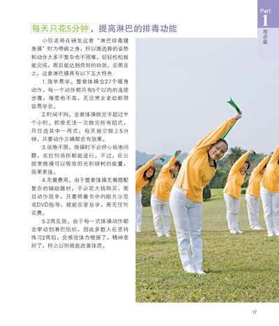 作者为了控制自己的病情,自行研发出一套完整的“淋巴排毒健身操”,提升自己的免疫力,进而控制了癌细胞发展。“淋巴排毒健身操”可刺激增强淋巴系统,只要每天坚持做,就有机会改变体质。