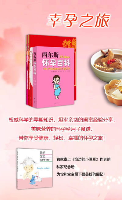 | “幸孕之旅”套装(包括《西尔斯怀孕百科》《孕幸福》《安胎健儿怀孕食谱》《补血养颜坐月子食谱》,赠送《你好,宝宝》。另赠送孕肤宝孕纹防护霜迷你装15克,或雀巢妈妈 |