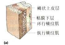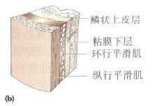 图1.6食管壁结构。(a)横纹肌层的近段结构。(b)平滑肌层的远段结构。